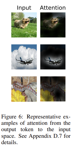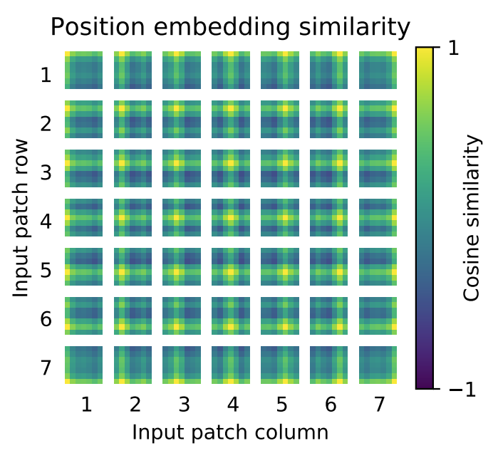 다음으로 위의 그림에서 가장 중앙 그림을 보면 positional embedding 유사도를 시각화하였네요. 이 시각화는 정말로 Positional Embedding vector가 데이터의 위치를 잘 표현하도록 학습이 되었다는 점을 보여줍니다. 패치마다 임베딩 벡터가 있을 것이고 모든 패치에 대응되는 벡터끼리 유사도 행렬을 계산했을 때 패치의 위치와 유사도 행렬이 크게 activate 되는 부분이 일치하는 것은 positional embedding이 잘 학습되었다고 볼 수 있겠죠.