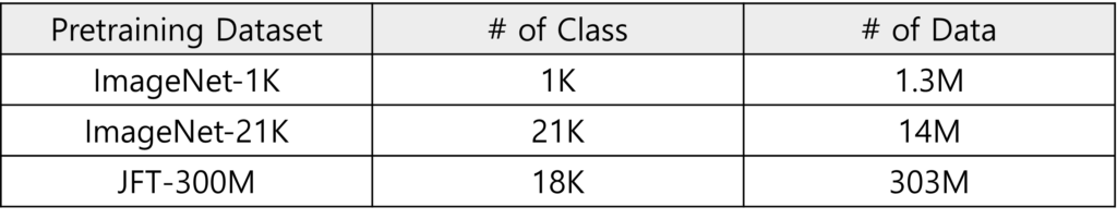 Vision Transformer는 Class와 이미지의 개수가 각각 다른 3가지의 데이터 셋을 가지고 사전 학습을 진행합니다.