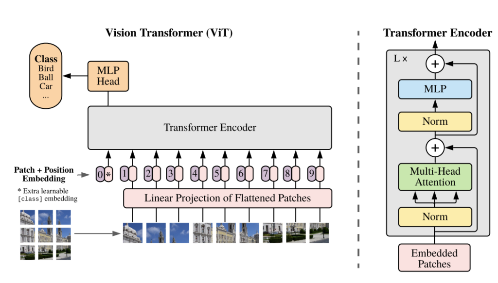 위의 그림을 보면 왼쪽 아래에 landmark 사진이 9등분으로 분할된 것을 확인할 수 있습니다. 이렇게 Patch들의 사이즈는 모두 동일하게 가져가고 분할된 Patch를 Flatten 시켜 1D vector의 형태로 만듭니다. 1D vector는 다시 Linear Layer를 거쳐 고정된 차원(D)을 가지는 vector로 projection 됩니다. NLP transformer에서 token을 만드는 거랑 똑같은 개념이라고 보시면 됩니다.