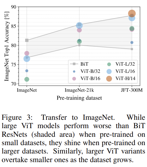 - 모델이 매우 커지면 성능이 어느 정도 saturation 되는 ResNet 대비 ViT는 saturation 되는 양상을 보이지 않습니다. 훨씬 더 큰 scale에서 성능을 기대해 볼 수 있다는 점을 시사하는 것 같네요.